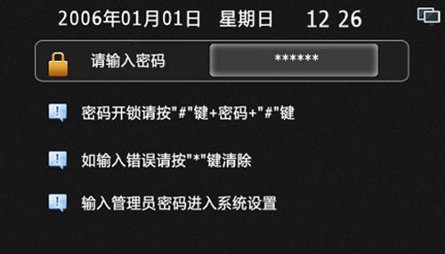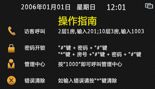 1) 門(mén)口機(jī)待機(jī)時(shí)的主界面,包括時(shí)間日期顯示,網(wǎng)絡(luò)是否在線(xiàn),訪(fǎng)客呼叫、密碼開(kāi)鎖、呼叫中心以及使用說(shuō)明,如圖3.1.1: