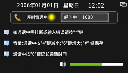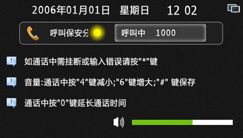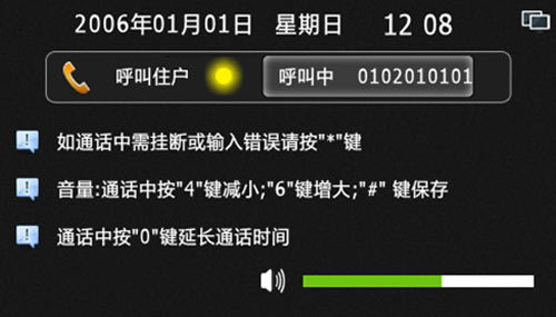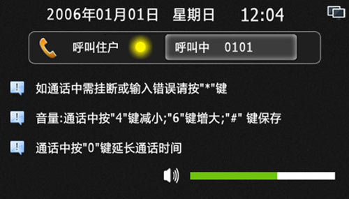 4) 輸入房號(hào)時(shí)錯(cuò)誤,可按“*”鍵清除,呼叫或通話(huà)過(guò)程中按“*”鍵可退出或結(jié)束通話(huà),通話(huà)中按“4”或“6”可減小或增大音量,通話(huà)中按“0”鍵可延長(zhǎng)通話(huà)時(shí)間至60秒。