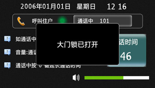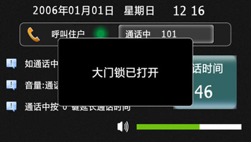 6) 呼叫業(yè)主或和業(yè)主通話(huà)時(shí),業(yè)主通過(guò)室內(nèi)機(jī)遠(yuǎn)程開(kāi)鎖,門(mén)口機(jī)將顯示“大門(mén)鎖已打開(kāi)”如下圖3.2.5: