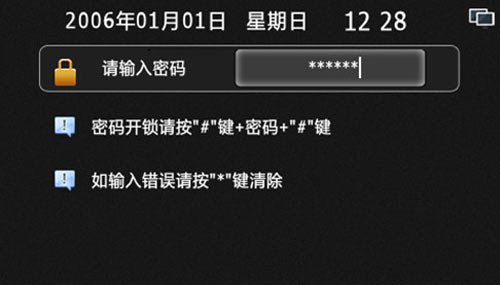 1) 設(shè)置機(jī)器的時(shí)間和日期,如果設(shè)置時(shí)間不合理,則會(huì)提示設(shè)置失敗。設(shè)備開(kāi)機(jī)或運(yùn)行時(shí)會(huì)自動(dòng)同步物業(yè)中心軟件的時(shí)間。格式為安居樂(lè)X-XX-XX XX:XX,例如2006-1-1 12:00,“*”鍵可清除錯(cuò)誤輸入,“#”確定保存并退出,設(shè)置界面如圖4.10.1:
