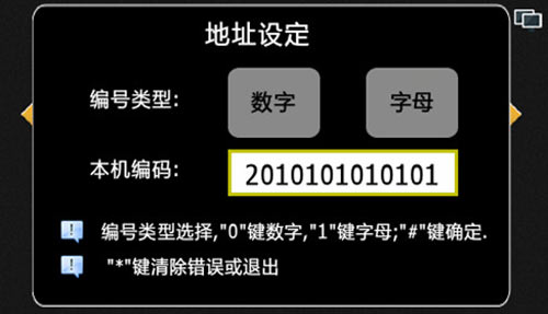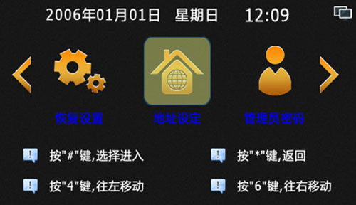 1) 進(jìn)入系統(tǒng)設(shè)置:主界面輸入“#”+6位管理員密碼+“#”(出廠(chǎng)默認(rèn)管理員密碼為666666),進(jìn)入系統(tǒng)設(shè)置界面,“*”鍵退出或清楚錯(cuò)誤輸入功能,“#”鍵為確定功能,“4”和“6”左右移動(dòng)選擇,進(jìn)入時(shí)默認(rèn)為地址設(shè)定,如圖4.1.1: