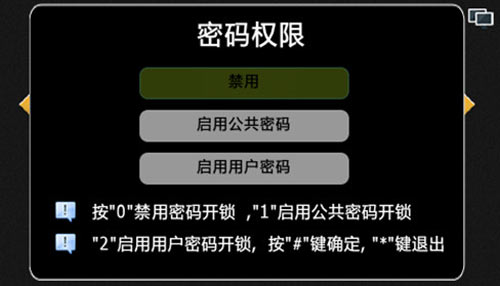 1) 設(shè)備出廠(chǎng)默認(rèn)開(kāi)鎖為禁用,按照界面提示,“0”選擇禁用,系統(tǒng)將無(wú)法使用開(kāi)鎖密碼來(lái)開(kāi)啟門(mén)鎖;“1”啟用公共密碼開(kāi)鎖,用戶(hù)可通過(guò)公共開(kāi)鎖密碼開(kāi)啟門(mén)鎖;“2”啟用用戶(hù)密碼開(kāi)鎖,用戶(hù)可通話(huà)用戶(hù)開(kāi)鎖密碼開(kāi)啟門(mén)鎖。“*”鍵退出,“#”鍵確認(rèn),設(shè)置界面如圖4.5.1: