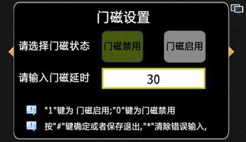 1) 設(shè)置門(mén)磁的啟用和禁用狀態(tài),以及門(mén)磁的延時(shí)。默認(rèn)門(mén)磁為禁用,延時(shí)為30秒,按“0”選擇門(mén)磁禁用,按“1”選擇門(mén)磁啟用,“*”鍵清除延時(shí)時(shí)間或退出門(mén)磁設(shè)置界面,“#”鍵保存設(shè)置并退出,如圖4.8.1:
