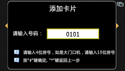 2) 添加IC卡操作:輸入需要添加IC卡的房號(hào),如果是在單元機(jī)上,輸入4位例如0101,如果是在圍墻機(jī)上,輸入10位房號(hào)例如0102010101(1區(qū)2棟1單元101戶(hù)),按“#”鍵確認(rèn),如圖4.12.2: