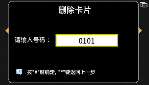 按“1”+“#”選擇房號(hào)后,輸入需要?jiǎng)h除所有卡對(duì)應(yīng)的房號(hào),如果在單元機(jī)上需輸入4位房號(hào),例如0101,如圖4.12.6,如果在圍墻機(jī)上需輸入10位房號(hào),例如0102010101。若該房號(hào)存在IC卡,則刪除該房號(hào)的所有住戶(hù)IC卡;若輸入的房號(hào)沒(méi)有卡片,則提示輸入的房號(hào)沒(méi)有卡片,如圖4.12.7: