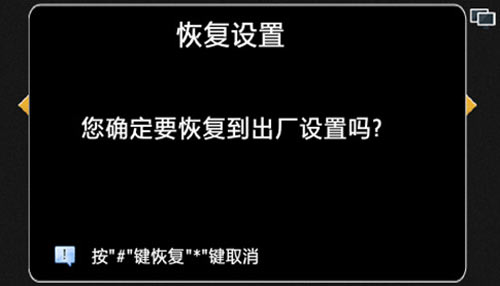 1) 點(diǎn)擊恢復(fù)設(shè)置按鈕,選擇是否恢復(fù)到出廠(chǎng)設(shè)置,按“#”確定恢復(fù)出廠(chǎng),按“*”取消恢復(fù)出廠(chǎng),如圖4.13.1: