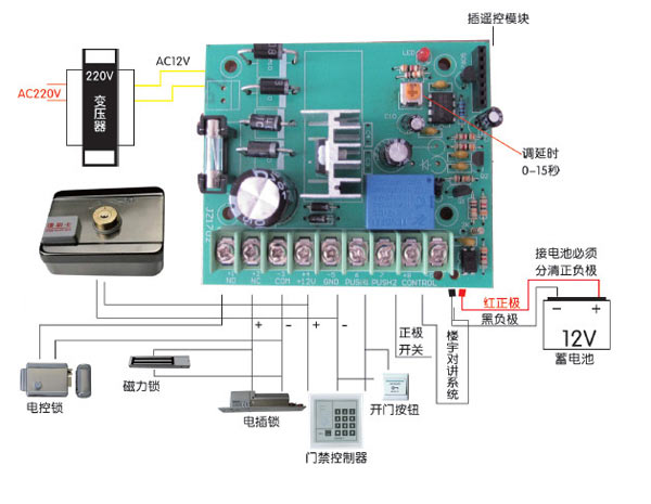 注意!接電控鎖時(shí)必須把延時(shí)調(diào)到0秒,以防止燒壞電控鎖線圈。