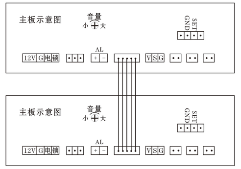 7、數(shù)據(jù)復(fù)制:斷電,撥掉主機(jī)按鍵板,用5P對插線插在按鍵板插座上,把2個(gè)主機(jī)板連接在起,如下圖所示:在目標(biāo)板主板上供電,供電后在目標(biāo)板上短路一下“GND管理卡”跳針,聽到繼電器振動(dòng)約10秒后停止數(shù)據(jù)即復(fù)制成功,這時(shí)2個(gè)主機(jī)板的卡數(shù)據(jù)相同,在多門口要求卡相同可以快速復(fù)制而不用每臺主機(jī)都用管理卡增加;