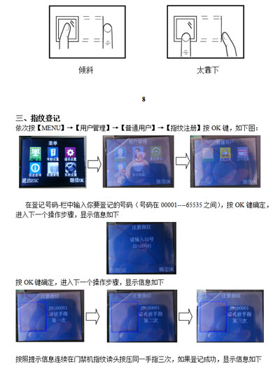 最終指紋還是無法識別的用戶,可將該指紋刷次再重新注冊,或注冊另一枚手指,這樣的用戶在注冊時需要選擇使用質(zhì)量較好的指紋(指紋清晰等),盡量使用手指接觸指紋采集頭面積大一些,注冊完成后做一下對比測試,并建議多注冊幾枚備用指紋。